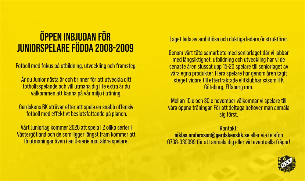 Nu välkomnar vi även juniorspelare födda 2008 och 2009 till öppna träningar mellan 10:e och 30:e november!